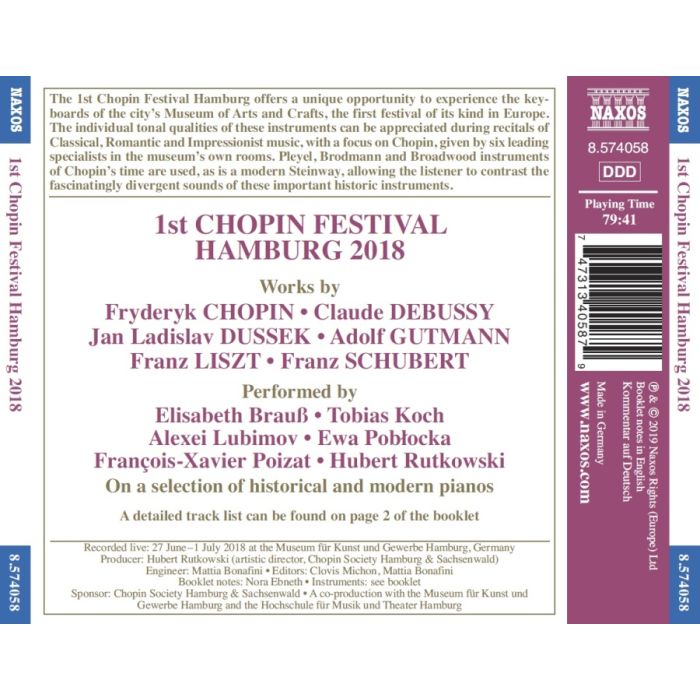 CHOPIN • DEBUSSY • DUSSEK • GUTMANN • LISZT • SCHUBERT • The 1st Chopin Festival Hamburg offers a unique opportunity to experience the keyboards of the city’s Museum of Arts and Crafts, the first festival of its kind in Europe. The individual tonal qualities of these instruments can be appreciated during recitals of Classical, Romantic and Impressionist music, with a focus on Chopin, given by six leading specialists in the museum’s own rooms. Pleyel, Brodmann and Broadwood instruments of Chopin’s time are used, as is a modern Steinway, allowing the listener to contrast the fascinatingly divergent sounds of these important historic instruments.