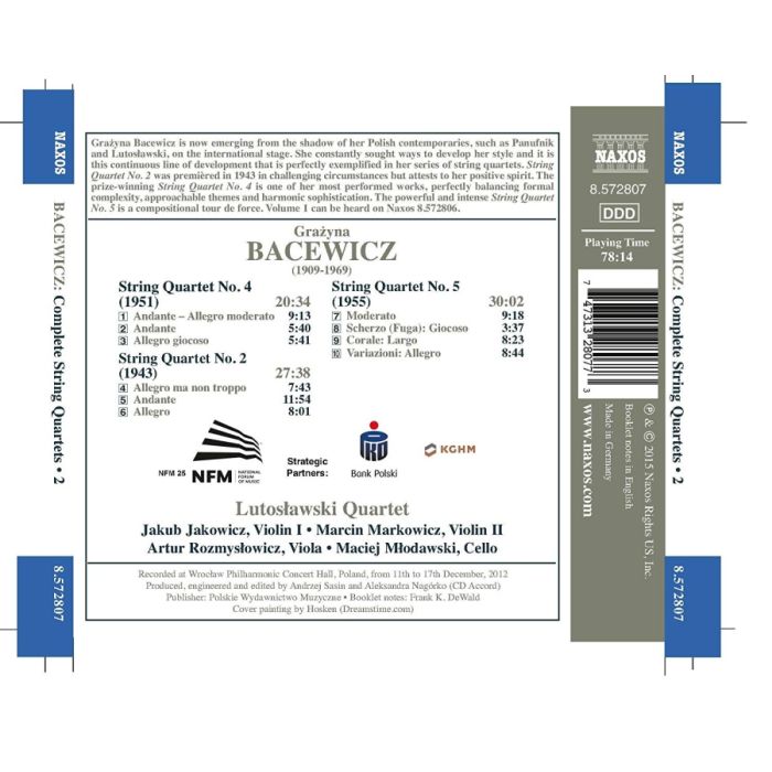 Grażyna Bacewicz is now emerging from the shadow of her Polish contemporaries, such as Panufnik and Lutosławski, on the international stage. She constantly sought ways to develop her style and it is this continuous line of development that is perfectly exemplified in her series of string quartets. String Quartet No. 2 was premièred in 1943 in challenging circumstances but attests to her positive spirit. The prizewinning String Quartet No. 4 is one of her most performed works, perfectly balancing formal complexity, approachable themes and harmonic sophistication. The powerful and intense String Quartet No. 5 is a compositional tour de force. Volume 1 can be heard on Naxos 8.572806.