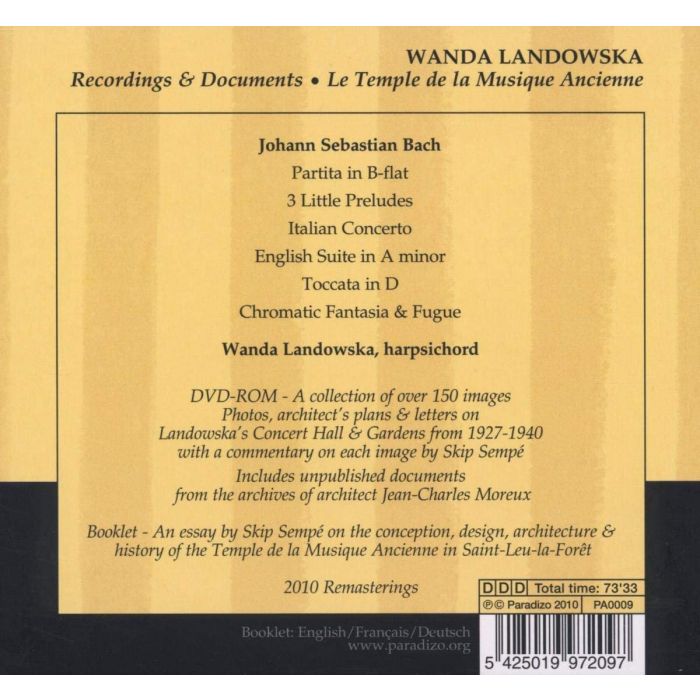 Wanda Landowska, born in Warsaw in 1879 and died in Lakeville, Connecticut, in 1959, is one of the most extraordinary musicians of the 20th century. When Landowska grew up and made music her life's work, the whole world considered the harpsichord to be the surviving predecessor of the modern piano, far inferior to the modern grand piano, because of its "unpleasant and little formative sound", even for playing the music of the "old masters". In 1899 Landowska played on such a harpsichord for the first time, succumbed to its peculiar sound, had her own instrument built by the Pleyel piano company and became a tireless champion of the harpsichord for the rest of her life