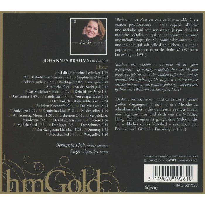 Nakład wyprzedany, ostatni egzemplarz Telegraph Classical CDs of the Year Independent on Sunday***** Sunday Times Classical CD of the Week Gramophone Editor s Choice 'this superb recital places Brahms back on his pedestal as one of the great lieder composers.' Hugh Canning, Classical CD of the Week, The Sunday Times, 11 February 2007, ***** 'Fink s voice is one of the loveliest to be heard today, at a time when there are many mezzo-sopranos of the very highest quality. She achieves an extraordinary intimacy in the recording studio, giving the impression that she is singing just for you as you listen at home. Harmonia Mundi s superb recording technique must, of course, take some credit for this, the balance with the marvellous piano-playing of Roger Vignoles being exceptionally true...Her singing of the glorious Die Mainacht is in itself enough reason to have this disc. What an artist!' Michael Kennedy, Sunday Telegraph, 18 February 2007 'For all the tragic, premature loss last year of Lorraine Hunt Lieberson, Argentinian Bernarda Fink is just one of a golden generation of mezzos vying for the mantle of Janet Baker. One of the most versatile, as at ease in Baroque repertoire as in music from Handel and Mozart to Schumann, Fink's rich, warm voice boasts the perfect blend of colour and clarity for this selection of 31 songs from the almost 200 Brahms wrote. Her musical intelligence combines with the sensitivity of Roger Vignoles to capture the folk-song spirit behind their urbane polish. Bernarda Fink has always been something of a connoisseur's singer, untouched by glossy promotional hype. This new Brahms recital confirms her credentials as a scrupulous, perceptive interpreter of Lieder. Her warm, glowing mezzo, flecked by darker, deeper tints, is lovely in itself. Beyond this, she sings each of these songs with unshowy eloquence and, abetted by the ever-discerning Roger Vignoles, an unerring feel for the curve and flux of Brahms's long-arched phrases. Other mezzos - Janet Baker, Christa Ludwig, Brigitte Fassbaender - have brought a more intense, impassioned style to the quintessentially Brahmsian songs of yearning and nostalgic regret. But Fink's refinement and relative restraint have their own rewards' Richard Wigmore, The Daily Telegraph, Saturday 10th March 2007.