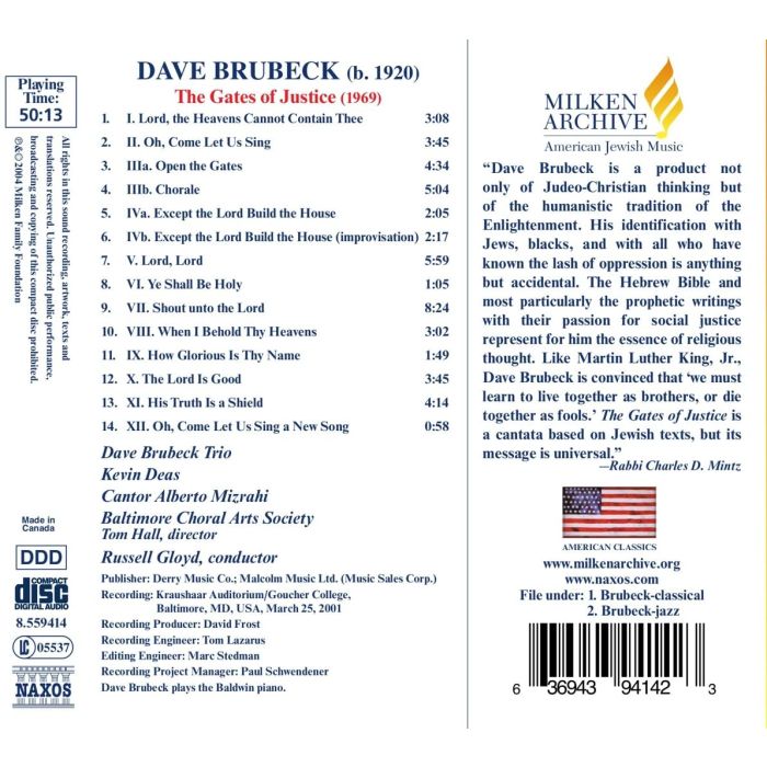 Dave Brubeck is a product not only of Judeo-Christian thinking but of the humanistic tradition of the Enlightenment. His identification with Jews, blacks, and with all who have known the lash of oppression is anything but accidental. The Hebrew Bible and most particularly the prophetic writings with their passion for social justice represent for him the essence of religious thought. Like Martin Luther King, Jr., Dave Brubeck is convinced that 'we must learn to live together as brothers, or die together as fools "The Gates of Justice is a cantata based on Jewish texts, but its message is universal