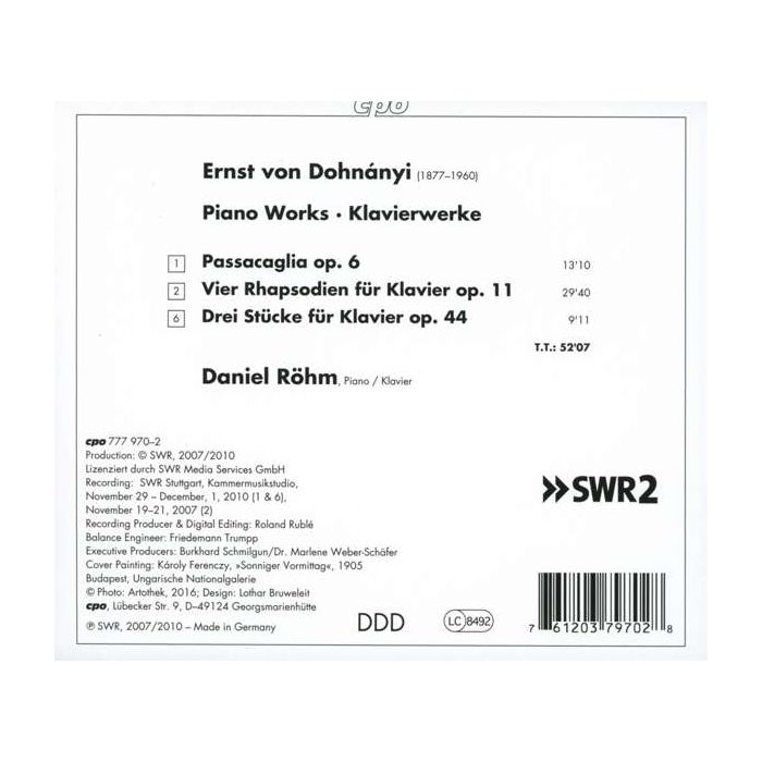 Music critics have always found it difficult to assign stylistic and qualitative labels to Ernst von Dohnányi (Hungarian: Ernő Dohnányi) – so it was in the past, and so it is today. Sometimes they have minimized his significance in the development of Hungarian music, and other times they have named him in the same breath with Bartók and Kodály. In any case, two things are certain: Dohnányi was not a revolutionary innovator, and a magnificent gift for melodic invention always distinguishes his music. After the release of his romantic Violin Concerto No. 1 with Ulf Wallin, we now are pleased to present some of his piano compositions, interpreted by Daniel Röhm, whose debut CD with Franz Schubert's late piano sonatas was awarded the Supersonic Award. And now Röhm sheds light on a little-known musical field represented by the sound world of this Hungarian composer whose works emerged from the tradition of Liszt and Brahms. Very early Dohnányi was regarded as one of the best pianists of his times, but he was also appreciated as a composer. On 16 February 1900 the Neues Wiener Tageblatt wrote, »His Passacaglia for Clavier is one of the most magnificent variation pieces that we know and, though strict in form, a very modern piece. The composer freely operates within the boundaries he has set for himself, so that not the slightest compulsion is to be observed in his work; he passes through all the schools of counterpoint, and all the while it is as if his imagination were pleasantly strolling along a delightful path.«