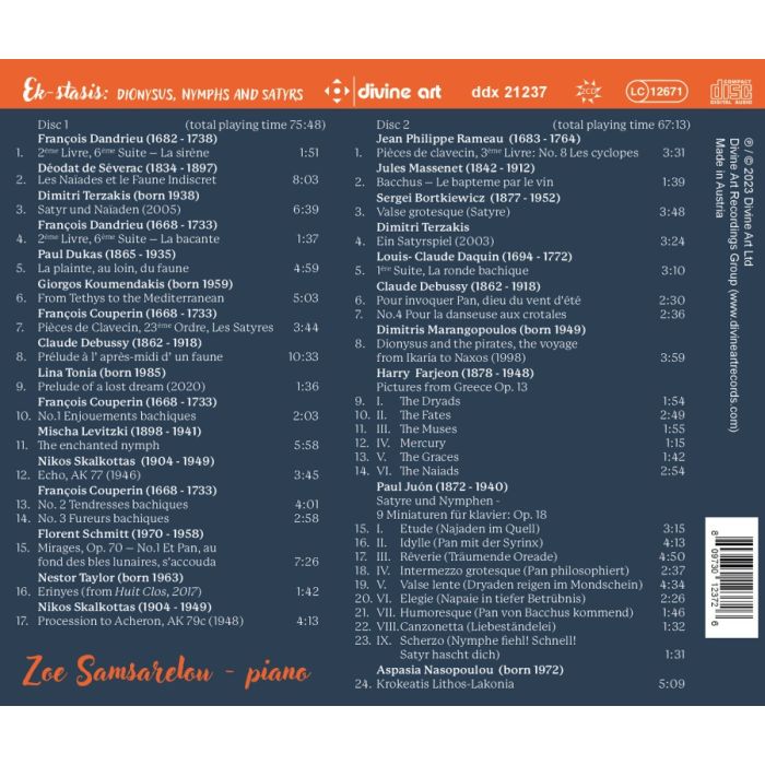 Greek pianist and professor Zoe Samsarelou has expertly curated a selection of works that weave together an interconnected narrative, taking you on a journey through the myth of Dionysus. From the works of Couperin, Rameau, Dandrieu, and Daquin to the eminent Greek composers of the 20th and 21st centuries and the Late Romantics in between, each piece is thoughtfully selected and presented.