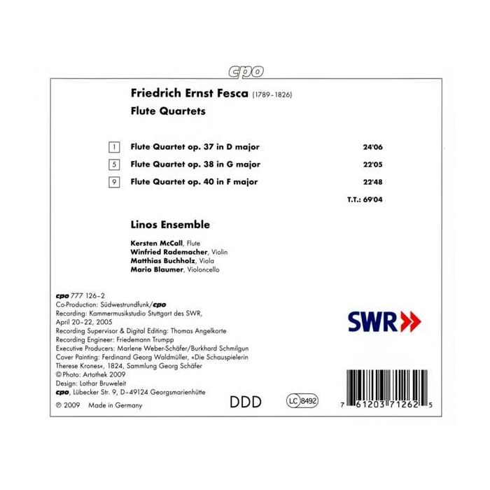 Since Friedrich Ernst Fesca was a splendidly trained violinist, it is hardly surprising that his masterfully elaborated sixteen string quartets quickly brought him a fine reputation as a composer. The quality and originality distinguishing Fesca’s string quartets is also very much in evidence in his flute quartets. These four-movement works are of great formal and conceptual unity. Their beauty does not lie in salient details or in catchy melodies; instead, Fesca’s personal style reveals little features all of its own and deviations from the norm of set or expected structures together with a fine sense of the integrative capacity of the four-part classical texture. Here the Linos Ensemble, familiar to the cpo listening audience from its marvelous recordings of the septets of Alexander Fesca, Friedrich Ernst Fesca’s son, freshly and spiritedly interprets three of the elder Fesca’s four quartets.