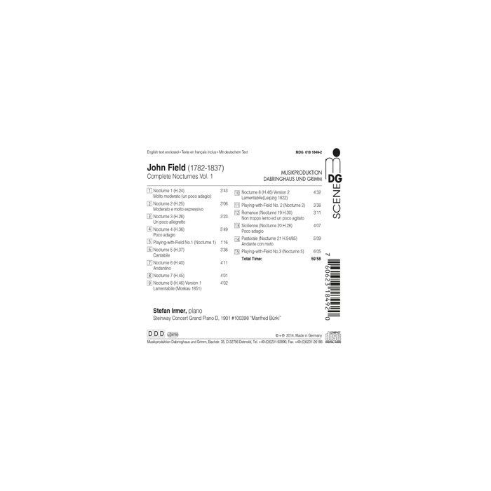 Simple melodies appealingly and tenderly hover over richly figured harmonies and seem to drift out into infinity. John Field is the author of these magical nocturnes, and one generation before the much more famous Pole (Chopin) he combined strongly expressive romanticism with an extraordinary keyboard intuition. Stefan Irmer performs on volume 1 of the complete nocturnes of John Field. Field never viewed his works as finished; every time he performed them he added something new to them inspired by the circumstances, the public, and the atmosphere of the moment. For this reason, some of his nocturnes have been transmitted in significantly different versions. Stefan Irmer rises to this challenging piano adventure: employing musical means from our times, he continues Field's music, adding his own ideas to it. Influences from jazz and tango are also in evidence.
