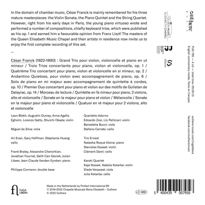 In the domain of chamber music, César Franck is mainly remembered for his three mature masterpieces: the Violin Sonata, the Piano Quintet and the String Quartet. However, right from his early days in Paris, the young piano virtuoso wrote and performed a number of compositions, chiefly keyboard trios, which were published as his op. 1 and earned him a favourable opinion from Franz Liszt! The masters of the Queen Elisabeth Music Chapel and their artists in residence now invite us to enjoy the first complete recording of this set.
