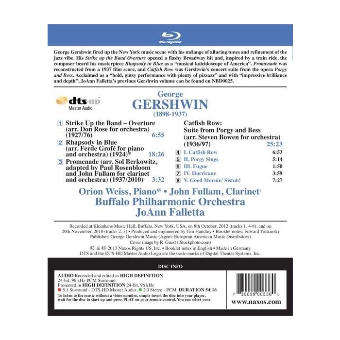 George Gershwin fired up the New York music scene with his mélange of alluring tunes and refinement of the jazz vibe. His Strike up the Band Overture opened a flashy Broadway hit and, inspired by a train ride, the composer heard his masterpiece Rhapsody in Blue as a “musical kaleidoscope of America”. Promenade was reconstructed from a 1937 film score, and Catfish Row was Gershwin’s concert suite from the opera Porgy and Bess. Acclaimed as a “bold, gutsy performance with plenty of pizzazz” and with “impressive brilliance and depth”, JoAnn Falletta’s previous Gershwin volume can be found on 8559705 or Blu-ray NBD0025.