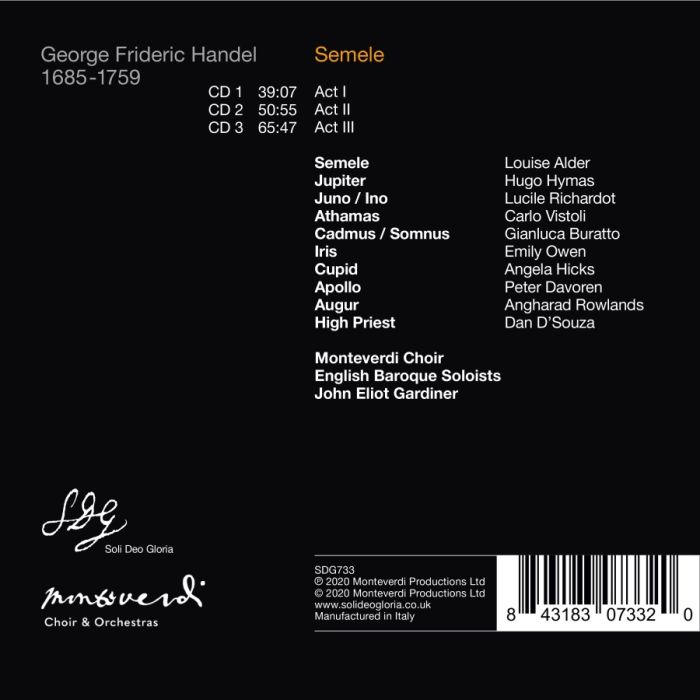 In Spring 2019, the Monteverdi Choir and English Baroque Soloists, led by John Eliot Gardiner, presented a critically-acclaimed European tour of Handel’s opera 'Semele', including Alexandra Palace Theatre in London, where this live recording took place. Semele had not been performed by John Eliot Gardiner and the Monteverdi ensembles since they originally recorded it in the 1980s and this recording gives listeners the chance to hear a fuller version of the work.
