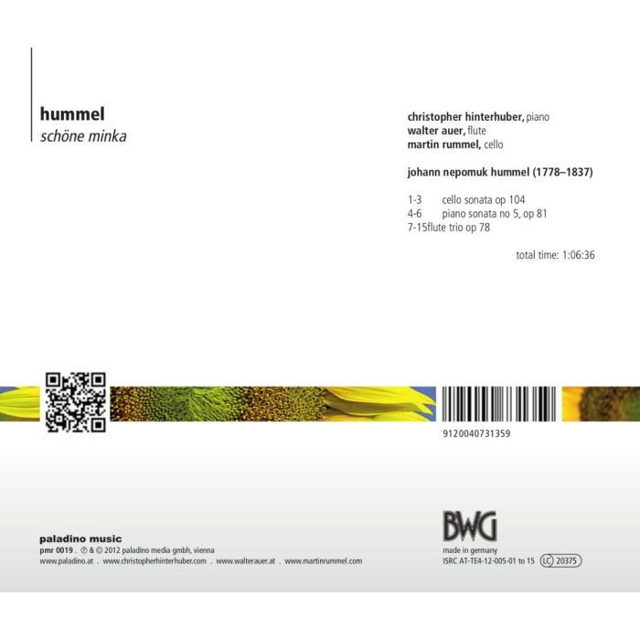 He must have been an amazingly impressive talent: Johann Nepomuk Hummel (1778 - 1837), who at the age of not even ten years was accepted into Mozart's household and taught free of charge by none other than Mozart. From 1788 to 1792 father and son Hummel were on a European tour, which led them via Germany, Denmark, England, Scotland and Holland back to Vienna. By this time Mozart had already died, and Hummel continued his studies with Albrechtsberger, Salieri and Haydn, from whom he also took over the position with Esterházy. When, after a brief engagement in Stuttgart, the offer of the Duke of Weimar came, Hummel enjoyed an astonishing career as a pianist and conductor from 1818, and there were times when he was considered the most famous piano virtuoso of his time. So it is not surprising that all three works on this CD, which originate from Hummel's Weimar period, assign the piano an important function. • Christoph Hinterhuber (piano) Walter Auer (flute) and Martin Rummel (cello) have recorded these rarely recorded works of Hummel in May 2012 in the Austrian castle Weinberg.