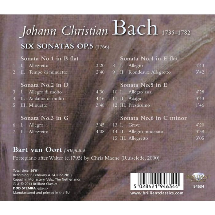 The genius of Johann Sebastian Bach often overshadows the achievements of his four prodigiously talented sons, all of whom played a crucial role in further advancing music’s development during the 18th century. Johann Christian, the youngest, was indeed among the most pivotal composers of his day, his move to Italy in 1755 precipitating a noticeable change in style that, known as the galant, looked forward to the soon-to-emerge Classical period. In 1762 the composer moved to London, where he soon acquired the title “English Bach”. Among his admirers was Wolfgang Amadeus Mozart, who studied and later arranged a number of the German maestro’s works.