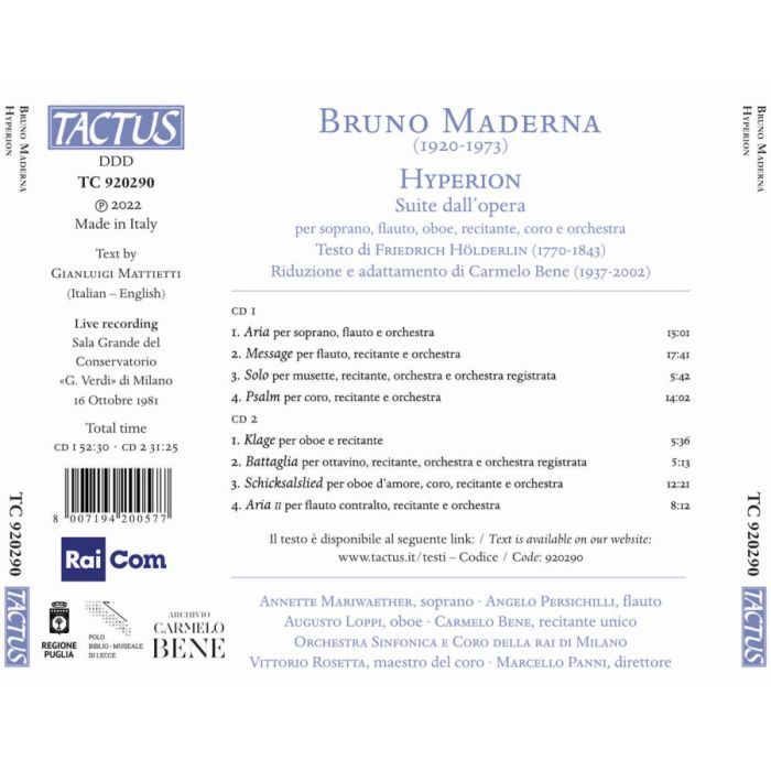 Bruno Maderna always attached great importance to insight and imagination, even during the period in which he followed the most rigorous serial procedures. Maderna’s preference for concreteness in sound images, his practical approach to composition problems, and his receptiveness to language diversity explain the extraordinary ascendancy he had over the Italian composers who visited Darmstadt in the Fifties and Sixties, including Nono, Berio, Donatoni, and Clementi. But they also explain his gradual withdrawal from the most radical experiments of the avantgarde, and his tendency, during the last decade, to pursue a constant osmosis between different styles and materials (also through frequent overflows between his own compositions), often ending up in theatrical forms. Hyperion has been described as “Lyric in the form of a show”. It was presented in its first version as a mobile cycle of vocal, orchestral and electronic pieces based on fragments of Friedrich Hölderlin’s novel Hyperion, oder der Heremit in Griechenland (“Hyperion, or the Hermit in Greece”), the only novel written by the German poet. This book, an epistolary novel, was published in various versions, so it somehow could be regarded as a “work in progress” too. This recording represents an important document of the live version, reduced and adapted by the great actor Carmelo Bene, flanked by the RAI Symphony Orchestra from Milan directed by Maestro Marcello Panni.