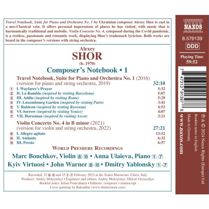 Travel Notebook, Suite for Piano and Orchestra No. 1 by Ukrainian composer Alexey Shor is cast in a neo-Classical vein. It offers personal impressions of places he has visited, with music that is harmonically traditional and melodic. Violin Concerto No. 4, composed during the Covid pandemic, is a restless, passionate and romantic work, displaying Shor’s trademark lyricism. Both works are heard in the composer’s versions with string orchestra.