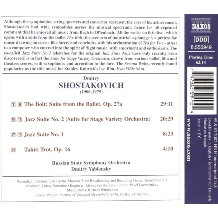 Bring on the performing dogs! The Bolt may be a ballet about industrial espionage, but Shostakovich’s music is an irresistible reminder of Russia’s circus tradition. It’s more distinguished than most music from the big top, but still conjures up the sight of clowns with ridiculously large shoes falling over each other. There’s the Bureaucrat with a silly piccolo solo, the equally ludicrous xylophone of the Conciliator, and although the serious Szostakowicz pokes his head above the wall for an instant in the Dance of the Colonial Slave-Girl, most of the music is good-natured fun. The Jazz Suites continue in much the same vein – there’s not much jazz in them, but their polkas, waltzes, galops and other dances are top-notch light music. Imagine Johann Strauss and Offenbach dragged into the 20th century, with a pinch of Prokofiev, and overlaid with Shostakovich’s own melancholy, and you’ll not be far off: the shorter first suite even makes a nod in the direction of Weill in its final foxtrot. Shostakovich wrote the Tahiti Trot (an arrangement of ‘Tea for Two’) in 40 minutes for a bet, and it outstays its welcome, but the rest of the disc is a delight, with tight, infectiously witty performances. Martin Cotton