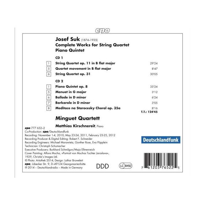 “In 1912, when my second quartet was performed in Berlin, a tumult arose in the audience that was not far from a tussle. On the one side, shouts of amazement; on the other side, expressions of displeasure and boos. Even Scho¨nberg, who attaches special value to flops, was envious of me because of this flop.” “…our generation too has fought for its ideals and had to wait long and often still is waiting to receive honest and full recognition of its efforts to produce a new musical language, which very often again became the basis for the new aspirations of the younger generation.” These words were not written by an anarchistic innovator but by the euphonious late romanticist Josef Suk. His second string quartet, however, is surely the most ambitious and ‘most modern’ work he penned. In the field of chamber music it also ranks as his most important. For cpo the Minguet Quartet has recorded Suk’s complete œuvre for string quartet – with Matthias Kirschnereit joining them for the early piano quintet.