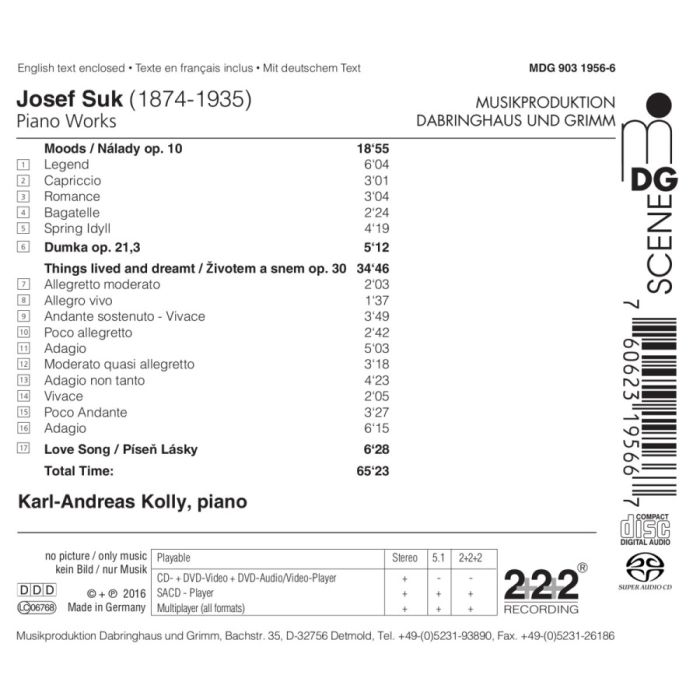 Unlike his massive orchestral tone poems, most of Josef Suk’s piano music is smaller in scale and often elegiac in nature. Yet it also is skillfully and idiomatically deployed for keyboard, and you can only wonder why pianists generally ignore such substantial, imaginative, and communicative piano music. Certainly the Op. 10 cycle’s opening Legend has everything a Romantically inclined virtuoso could wish for: soaring melodies, lush textures, just enough polyphony, and a grand climax. The Capriccio’s restless modulations and disarmingly humorous thematic material engage the mind as much as they tickle the ears. The Dumka’s gorgeous lyricism and evocations of speech patterns add up to a miniature masterpiece: Rachmaninov meets Janácek, perhaps? The 10 pieces encompassing Suk’s 35-minute-long piano cycle, Things lived and dreamt, find the composer in particularly inspired fettle. No. 5’s mutedly sardonic broken octaves and clipped phrases backed up by quirky arpeggios suggests an animated cartoon accompanied by late Liszt. No. 6 is akin to a Dvorák Slavonic Dance, but harmonically updated and rhythmically displaced. No. 14’s lilting demeanor and witty embellishments suggest a Czech rag, while the extraordinary final piece’s soft and sparse left-hand accompaniment and rhapsodic right-hand lines foreshadow similar textures in Messiaen’s bird-inspired works. Pianist Karl-Andreas Kolly not only plays marvelously well from a technical standpoint, but he also understands how to use tone color to bring out each work’s appropriate atmosphere, and how to keep the underlying rhythms alive. Furthermore, his artistry is enhanced by MDG’s multi-channel concert hall ambience and the singular qualities of its 1901-vintage house Steinway grand. All I can say is that MDG ought to enlist Kolly to set down more Suk, and not just because Supraphon’s reference edition of the composer’s complete piano music with pianist Pavel Stepán is hard to source as of this writing. Enthusiastically recommended.