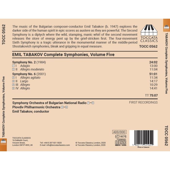 The music of the Bulgarian composer-conductor Emil Tabakov (b. 1947) explores the darker side of the human spirit in epic scores as austere as they are powerful. The Second Symphony is a diptych where the wild, stamping, manic whirl of the second movement releases the store of energy pent up by the grief-stricken first. The four-movement Sixth Symphony is a tragic utterance in the monumental manner of the middle-period Shostakovich symphonies, bleak and gripping in equal measure.