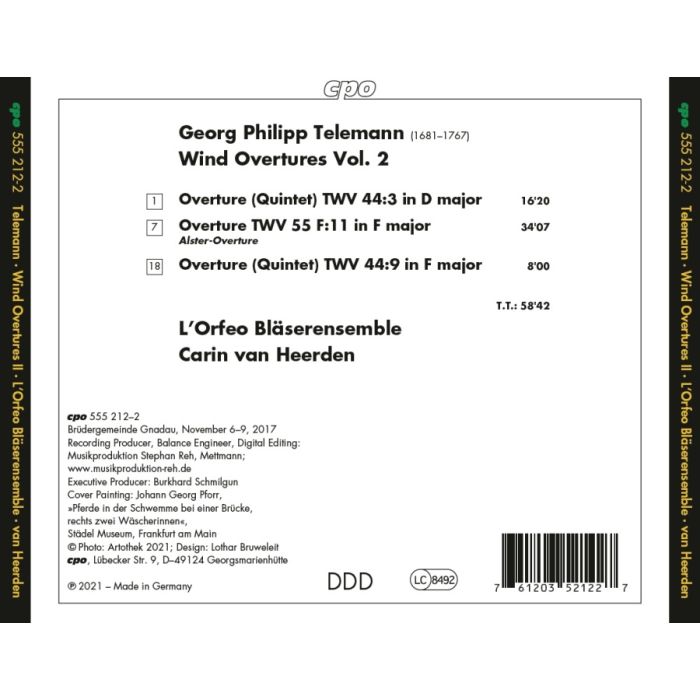 «Specializing in unknown repertoire, cpo is now serious about uncovering yet another veritable treasure«: this is what klassik-heute wrote of Vol. 1 of our Wind Overtures by Telemann. This master of all musical trades was also active and extremely successful in the field of Harmoniemusik – the compositional genre for wind ensembles entrusted with military, hunting, and table music. The wind version of the work known as the »Alster Overture« heard along with other works on Vol. 2 is regarded as a model example of this artistic philosophy of Telemann’s. However, what is a more important key to the significance of the work is the knowledge that the movements following the overture are practically to be understood as an audio instrumental preview of the serenata composed by Telemann and going along with them. In this overture suite the »musical artist« presents to our ears highly atmospheric sound depictions of Hamburg and what were then its country surroundings, through which the Alster River flowed. Even the singing swans majestically gliding along the Alster are represented in a wonderfully beautiful sarabande. At the end there is a spirited gigue in which shepherds, hunters, nymphs, and Pan, as it were, gather together again in order to conclude the musical preview anticipating the serenade.