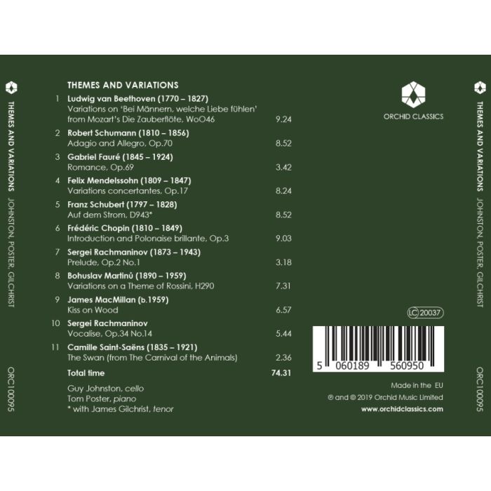 Cellist Guy Johnston and pianist Tom Poster first met at the BBC Young Musician of the Year Competition in 2000, and have been firm friends and frequent collaborators ever since. During their many recitals together, Johnston and Poster have found themselves returning again and again to certain works, associating these pieces with key moments in their lives, or simply deriving great pleasure from the sheer quality of the music. Theme and Variations includes three sets of variations, but also reflects the broader theme of lives intertwining: two musicians going in different directions but regularly resuming their musical partnership. Johnston and Poster are joined for a Schubert song by exceptional tenor James Gilchrist, and, alongside sets of variations by Beethoven, Mendelssohn and Martinů, we hear deliciously romantic music by Rachmaninoff and Fauré, and Kiss on Wood by contemporary Scottish composer Sir James MacMillan. To end the programme, Saint-Saëns’ Swan glides into view and off into the distance.
