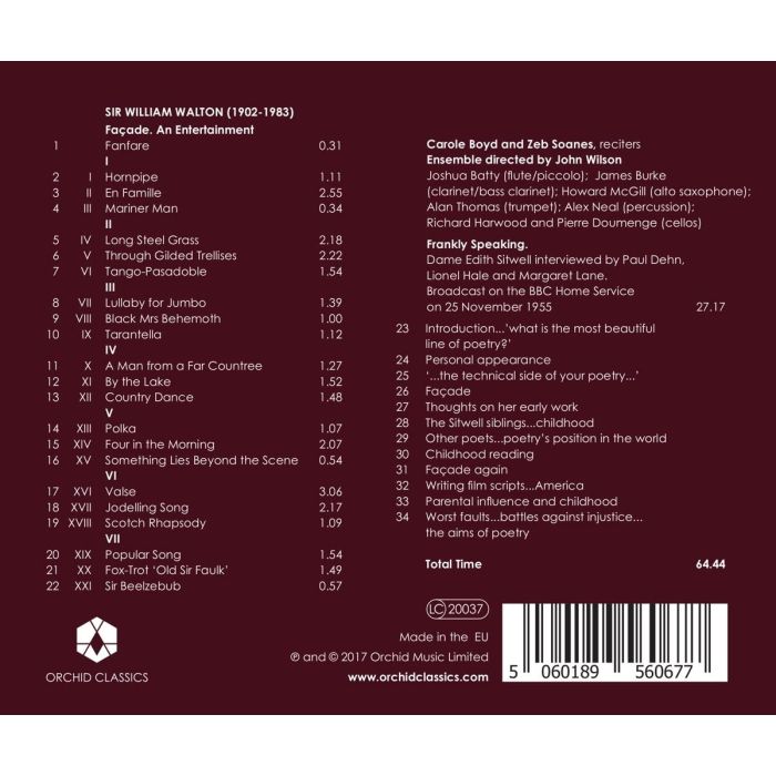 One of Walton's most idiosyncratic pieces, this new recording celebrates the wonderfully eccentric Dame Edith Sitwell, both through Facade and with the little heard radio interview from 1955 of the poet herself. Recorded and produced by Andrew Keener, one of the world's most distinguished record producers, it is the fulfilment of one of his life's ambitions! Carole Boyd has performed for over 35 years in theatre, television and radio, and is well known as Lynda Snell in BBC Radio 4’s The Archers. Zeb Soanes is also a familiar voice as a pressenter on BBC Radio 4 and on UK television. John Wilson is internationally renowned as a conductor of light music and jazz, especially for his appearances on the BBC Proms.