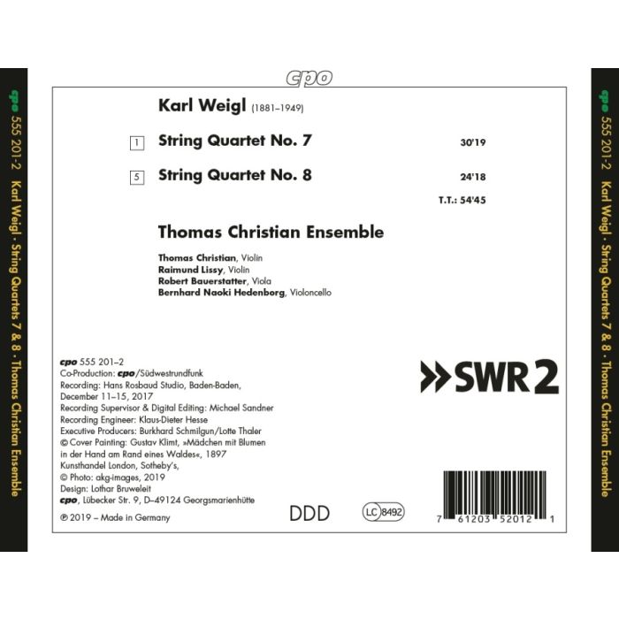 Karl Weigl’s Last Quartets • Following Karl Weigl’s Cello Concerto, we are now releasing his last two String Quartets, his seventh and eighth such works, which were neither commissioned works nor performed during his lifetime. The premiere of Quartet No. 7 was held at the Austrian Institute in New York in 1956, seven years after the composer’s death, and the Concord Quartet premiered Quartet No. 8 at Lincoln Center in New York only years later, in 1973. Weigl completed his next-to-last quartet in January 1942 and in this work much more clearly than in its successor adheres to the finely felt lyricism generally distinguishing him as a composer. It is a work without »screams« and hardly anything would lead us to suspect that it is not a composition from Weigl’s years in Vienna. The same cannot be said of his eighth and last quartet. Weigl knew how to shock his listeners without needing to seek refuge in unresolved dissonances. And this quartet indeed is shocking. The first movement is blunt and mysterious at one and the same time. With its dotted motif the fugued development section strives toward a coda that in the end modulates from minor to major without prior warning. An agonizing but tender melancholy marks the following movement: only Weigl was able to send waves of gloomy brooding through such gentle pondering. The conclusion has the effect of a lonely, mute scream in the night.