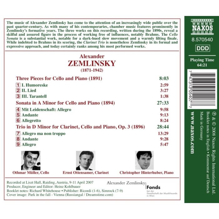 The music of Alexander Zemlinsky has come to the attention of an increasingly wide public over the past quarter-century. As with many of his contemporaries, chamber music features prominently in Zemlinsky's formative years. The three works on this recording, written during the 1890s, reveal a skilful and assured figure in the process of working free of influences, notably Brahms. The Cello Sonata is a substantial work, notable for a dark-hued slow movement and a warmly lilting finale. While indebted to Brahms in its scoring, the Clarinet Trio is nonetheless Zemlinsky in its formal and expressive approach, and today certainly ranks among his most performed works.